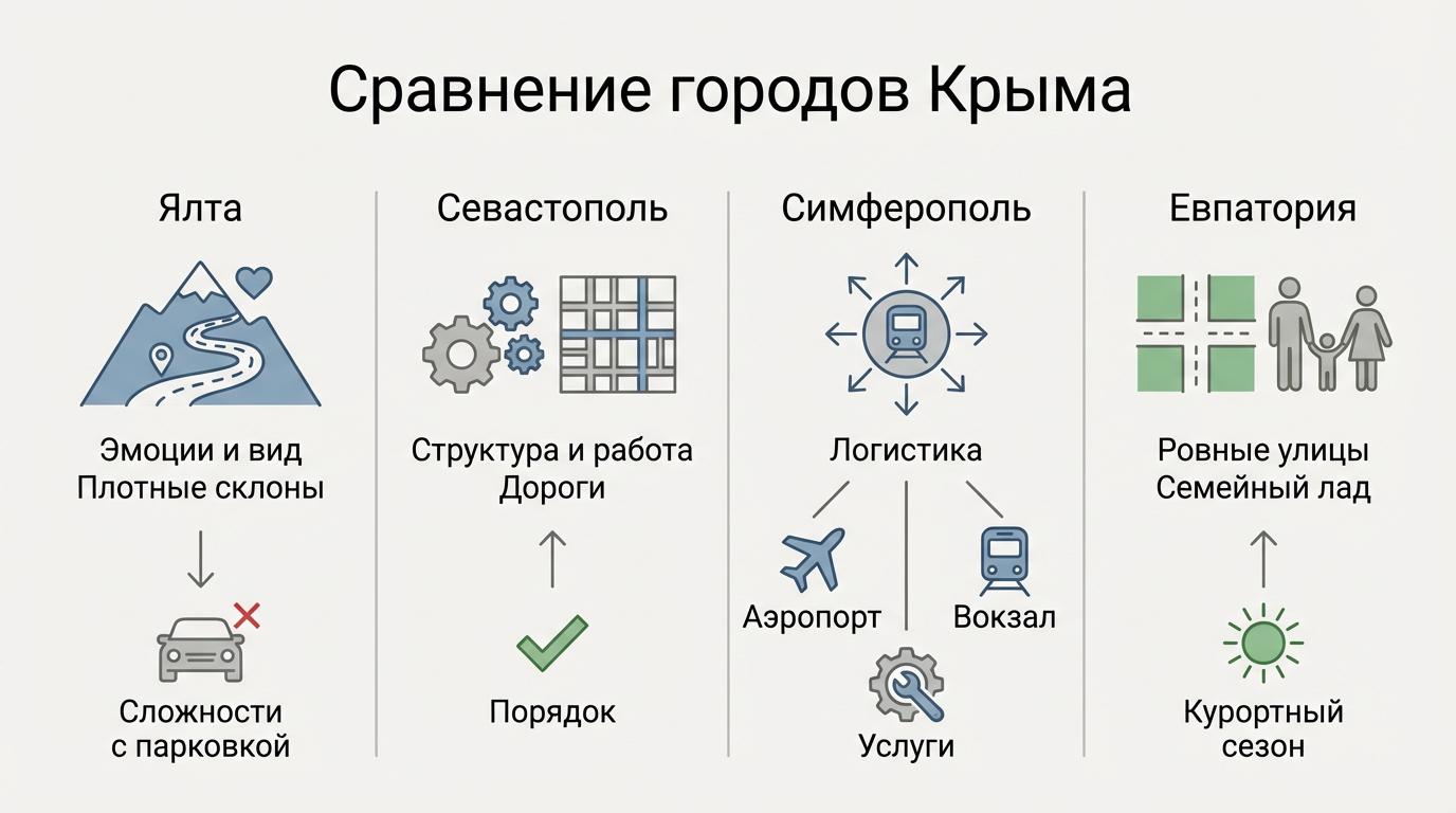 У каждого города свой ритм: Ялта про эмоции и вид, Севастополь про структуру и работу, Симферополь про логистику и центры услуг, Евпатория про ровные улицы и семейный лад.
